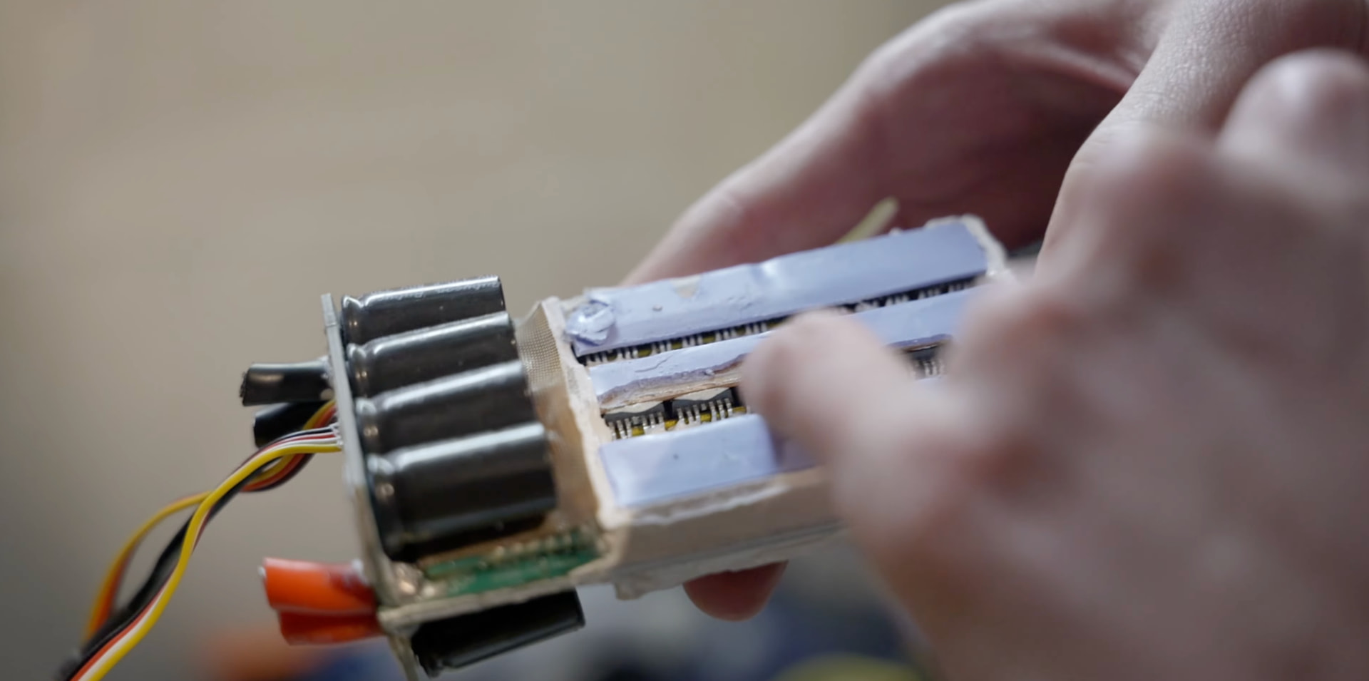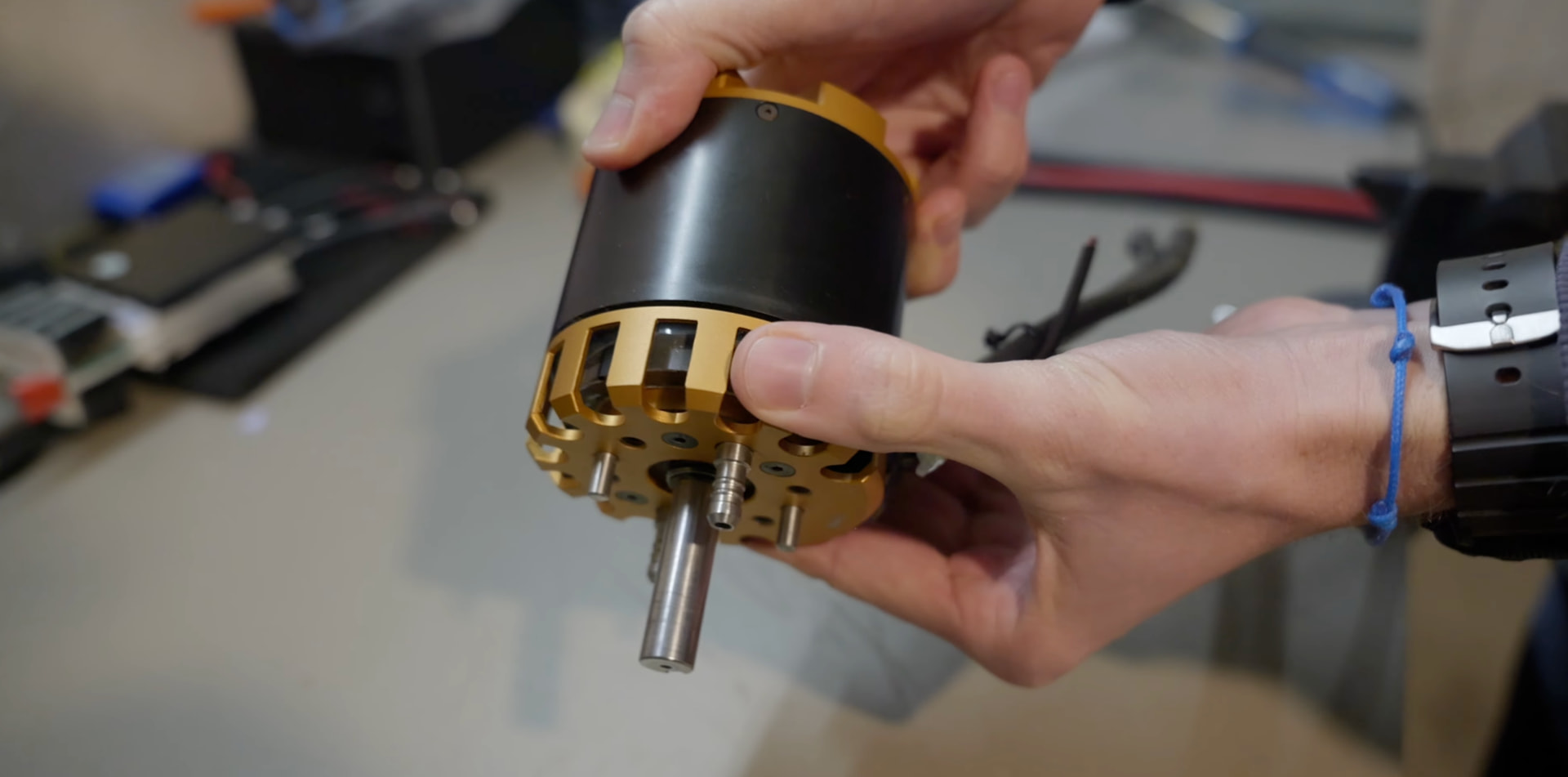 It’s powered by an outrunner with and high-current ESC, the whole on a 16S battery pack.